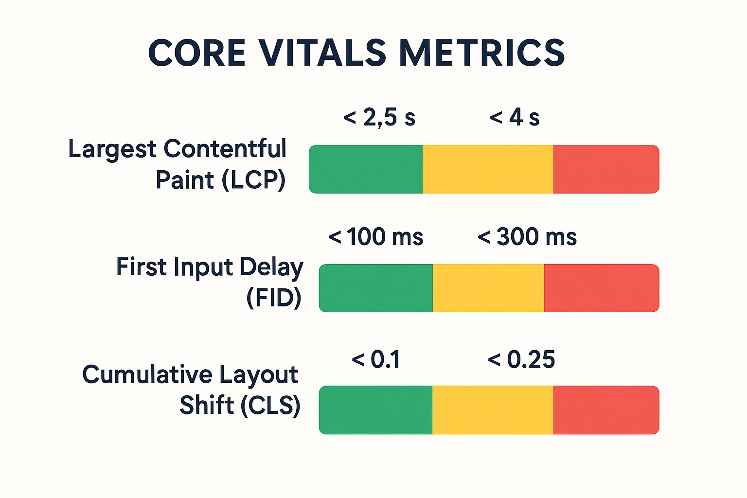 Core Web Vitals are Google’s three key user-experience signals that focus on loading, interactivity, and visual stability: